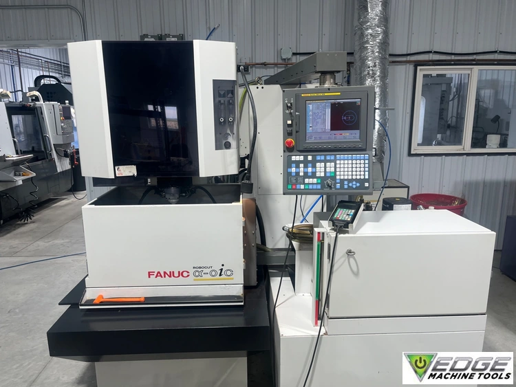 Fanuc Robocut Alpha 0iC Wire EDM, 2005 model, offers 5-axis control, 1100 lb table load capacity, and up to 30° taper cutting. Equipped with Fanuc CNC, linear glass scales, and auto threading. Includes chiller and shipping brackets. Submerged cutting enabled.